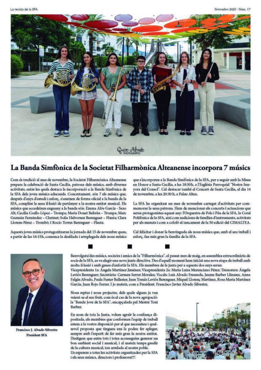 En este número de la revista, el contingut està dedicat a la celebració de les Jornades Musicals en honor a Santa Cecília, organitzades per la Societat Filarmònica Alteanense, entre el 25-oct i 7-des de 2025, entre altres temes d’actualitat de l’entitat.