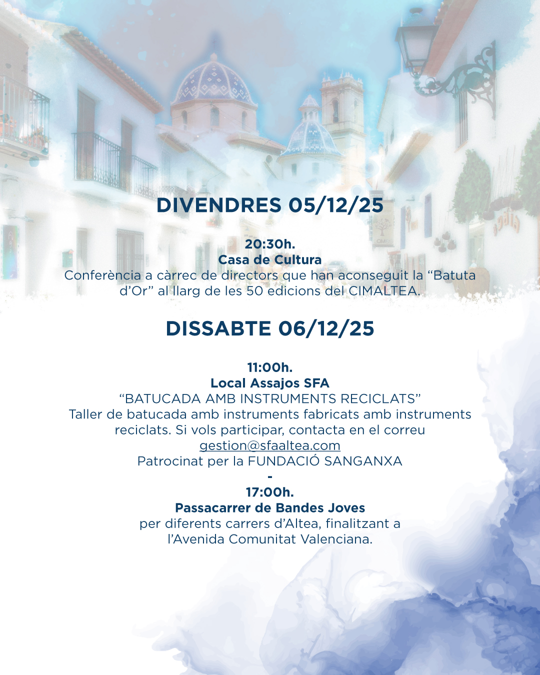 Al voltant del 50 CIMALTEA + Add to Google Calendar + iCal / Outlook export 00 days 00 hours 00 minutes 00 seconds Date 28 Nov 2025 - 06 Dec 2025 Time All Day Location Altea Altea Category CIMALTEA SFA Organizer CIMALTEA Other Organizers SFA Share this event