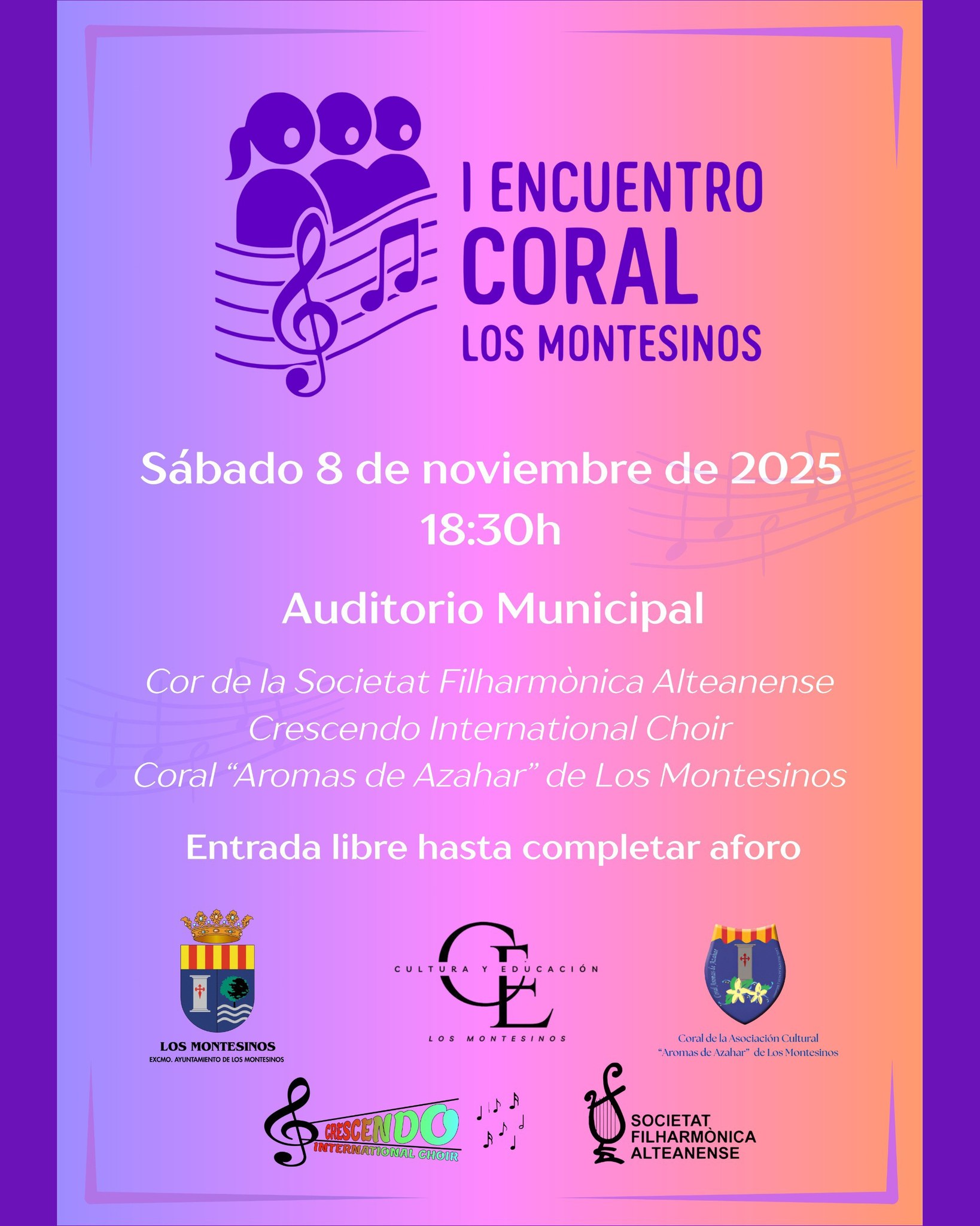 Dissabte 8 de novembre a les 18.30h a l’Auditori de l’Escola de Música i Cultura de Los Montesinos, trobada de Corals: